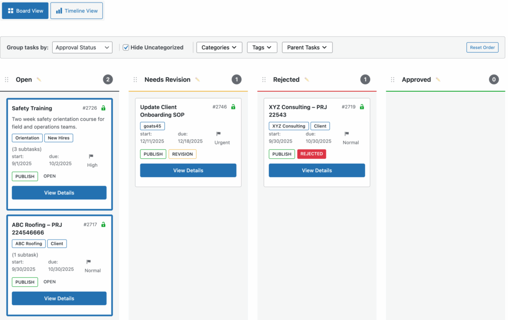 Changes made via drag and drop are fully integrated with the task edit screen. Moving a task on the Kanban Board updates the same field values you’d see in the WordPress task editor and quick edit GUI, maintaining consistency across all interfaces.