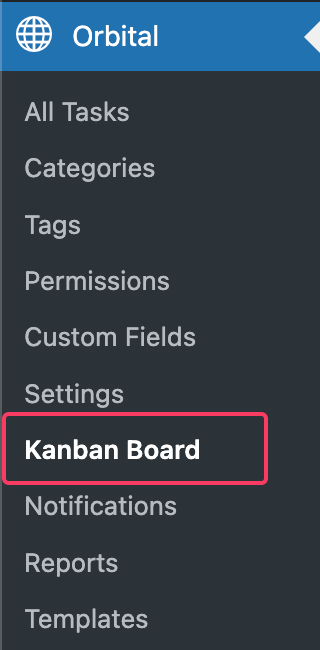 Navigate to Orbital > Kanban Board in your WordPress admin menu. The board loads with tasks grouped by Priority by default.